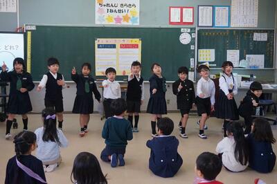 来年入学予定の園児が学校に来て、1年生と一緒に過ごしました。